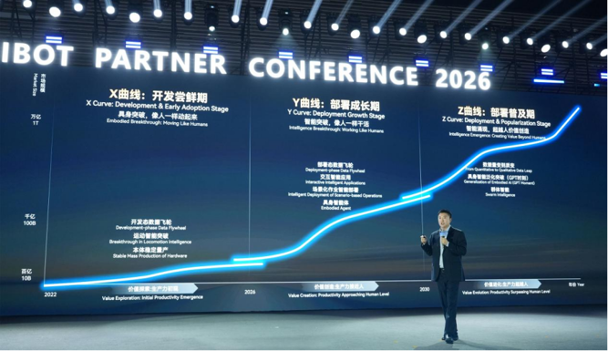 Y曲线(2026年至2030年)为部署成长期。2026年3月,智元1万台机器人下线,硬件一致性、规模化交付能力达到行业顶尖水平,交互智能与作业智能规模化落地,部署态数据飞轮驱动生产力持续逼近人类水平。