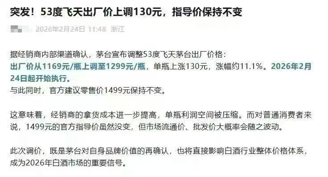 日前,有市场传言称,茅台宣布调整53度飞天茅台出厂价从1169元/瓶上调至1299元/瓶,单瓶上涨130元,涨幅约11.1%。2026年2月24日起开始执行。与此同时,官方建议零售价为1499元,保持不变。