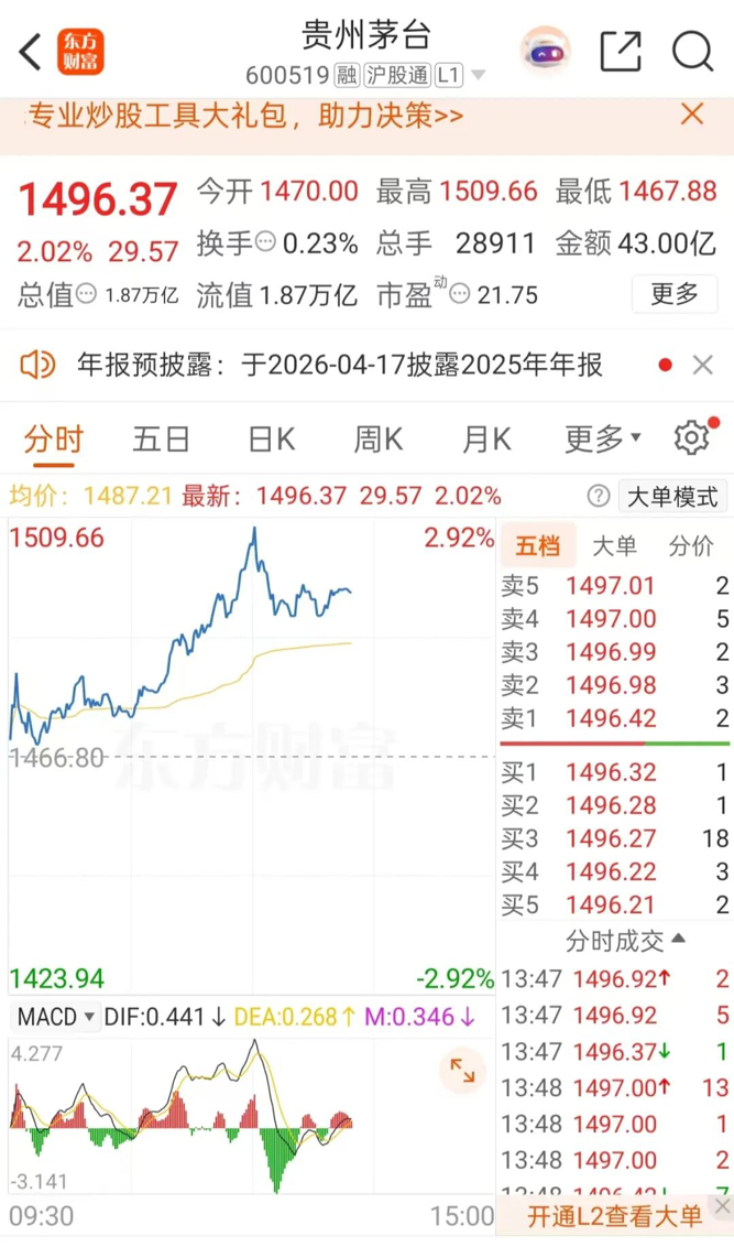 截至记者发稿,贵州茅台上涨2.02%,报1496.37元/股,较辟谣前略有回落。