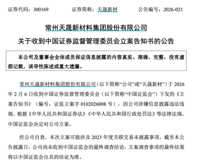 天晟新材表示,本次立案可能涉及2023年度关联交易未披露事项。截至公告披露日,公司尚未收到中国证监会的最终调查结论,立案调查事项的最终结果将以中国证监会出具的结论为准。