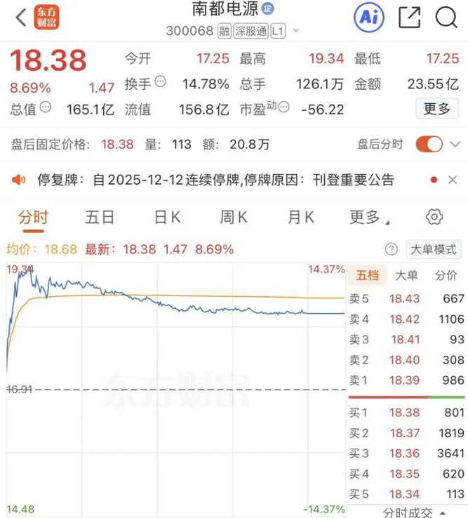 12月11日,南都电源股价一度涨超14%,截至收盘,上涨8.69%,报18.38元/股,总市值为165.1亿元。