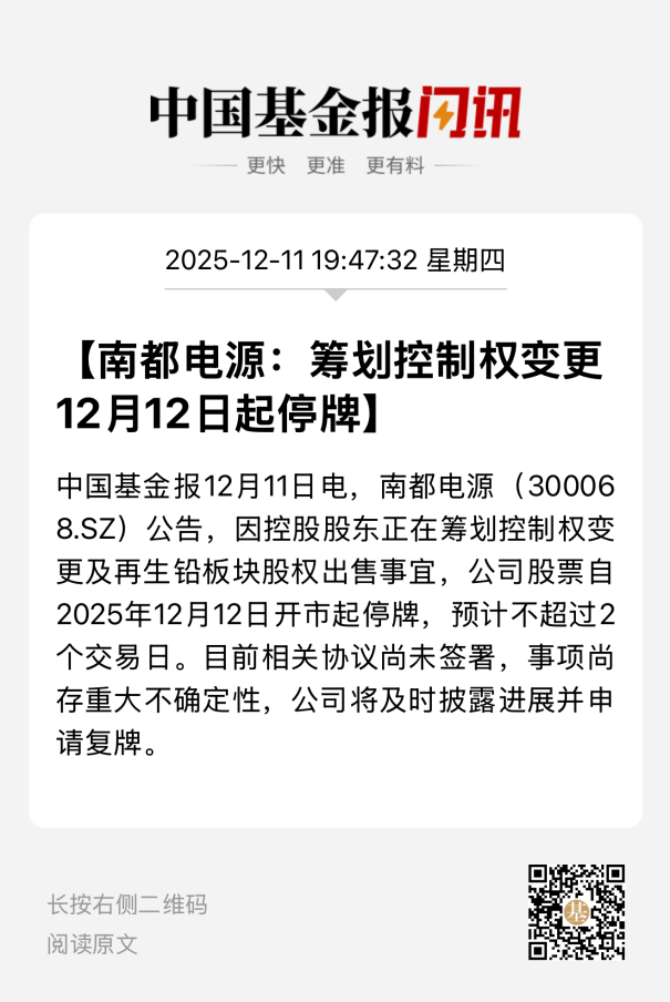 公司股票自2025年12月12日(星期五)开市起停牌,预计停牌时间不超过2个交易日。