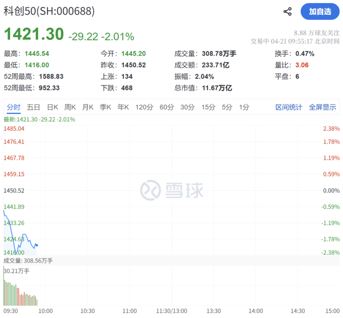 4月21日,科创50指数开盘走低,盘中跌超2%。
