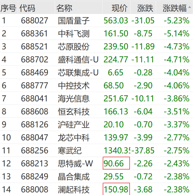 成份股中,芯片、半导体等方向集体走弱。国盾量子、中科飞测跌超5%,芯原股份、海光信息、沪硅产业、龙芯中科等跌幅居前。