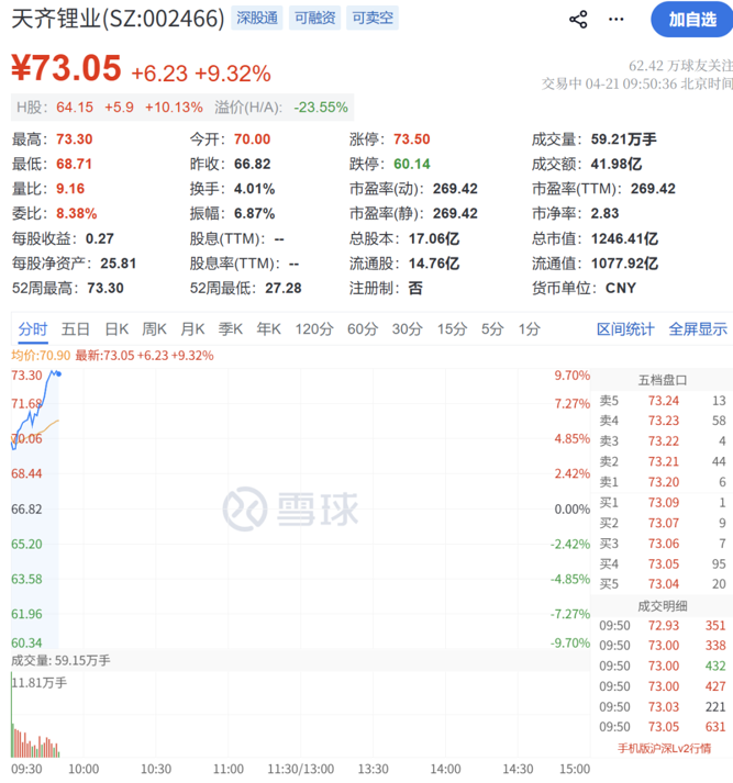 4月21日上午,A股锂矿板块逆市走强。天齐锂业盘初逼近涨停,永杉锂业、赣锋锂业、融捷股份等跟涨。
