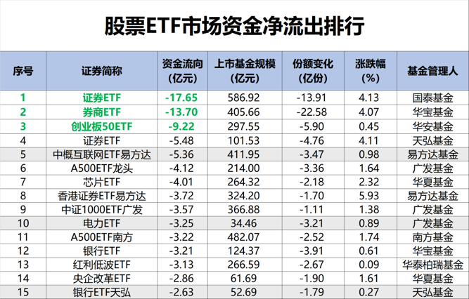 资金流出方面,券商板块净流出居前,证券ETF、券商ETF资金净流出分别超17亿元、13亿元。另外,芯片ETF、电力ETF、银行ETF等行业ETF净流出也较多。