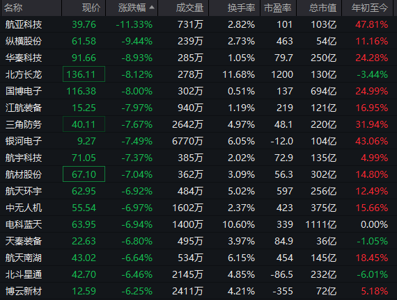 航天军工板块跌幅居前