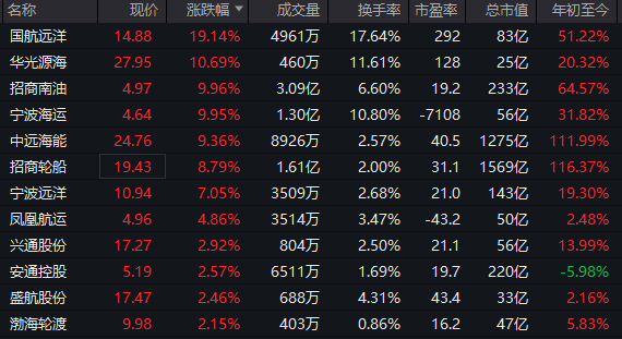 航运板块反复走强,国航远洋涨超19%,招商南油6天3板,中远海能、招商轮船、宁波海运等涨幅靠前。
