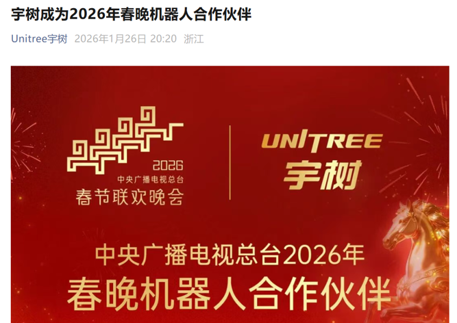 1月26日,宇树科技官方微信公众号发文称,其成为2026年春晚机器人合作伙伴。