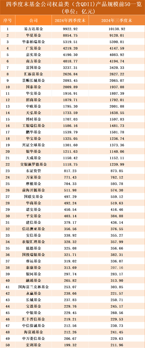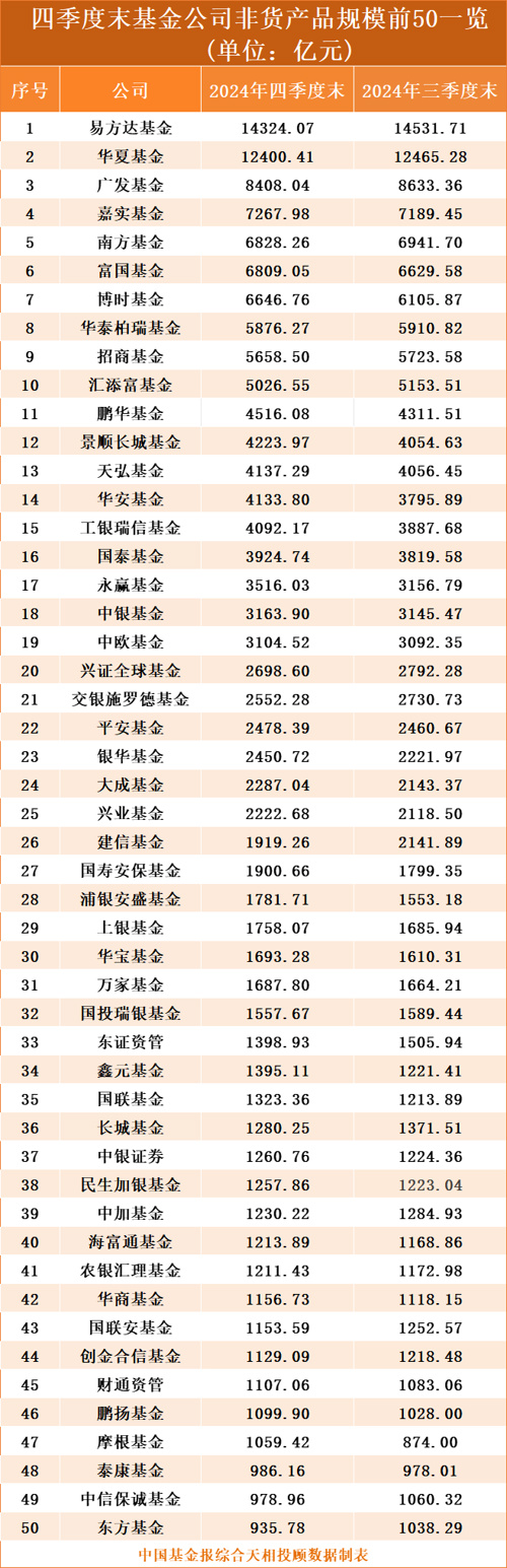 根据天相投顾数据,截至2024年四季度末,剔除货币基金后共有47家基金公司规模超过1000亿元,较三季度末减少一家。