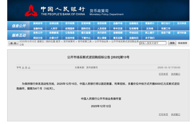 12月12日,央行发布消息称,为保持银行体系流动性充裕,2025年12月15日,中国人民银行将以固定数量、利率招标、多重价位中标方式开展6000亿元买断式逆回购操作,期限为6个月(182天)。