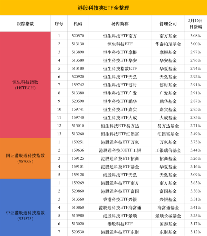 3月16日,港股科技像被按了加速键,以恒生科技指数为代表的科技股集体飙升。截至港股收盘,恒生指数收涨1.45%,恒生科技指数收涨2.69%。锂电池、芯片、新能源车企、新消费、OpenClaw、生物科技等概念股涨幅居前。多只跟踪港股通科技指数与创新药主题的ETF涨幅明显。今天我们就用最清晰的视角,拆解港股科技的具体情况,以及可关注的ETF清单。行情到底有多猛?