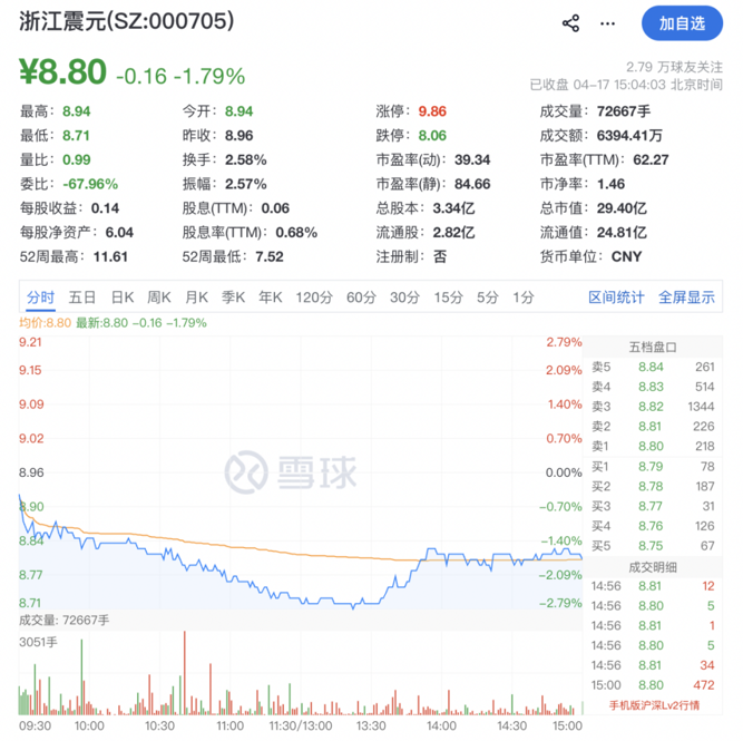 截至4月17日收盘,浙江震元股价报8.8元/股,总市值为29亿元。