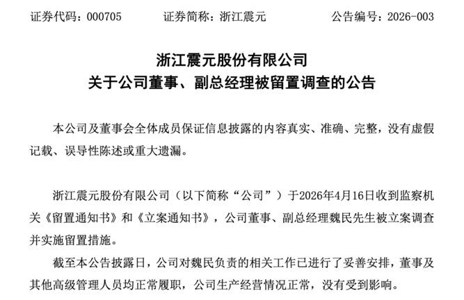 4月17日晚间,浙江震元发布公告称,公司于4月16日收到监察机关《留置通知书》和《立案通知书》,公司董事、副总经理魏民被立案调查并实施留置措施。