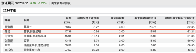 2024年,魏民的年薪为47.39万元。截至2024年年末,魏民持股数量为2万股。
