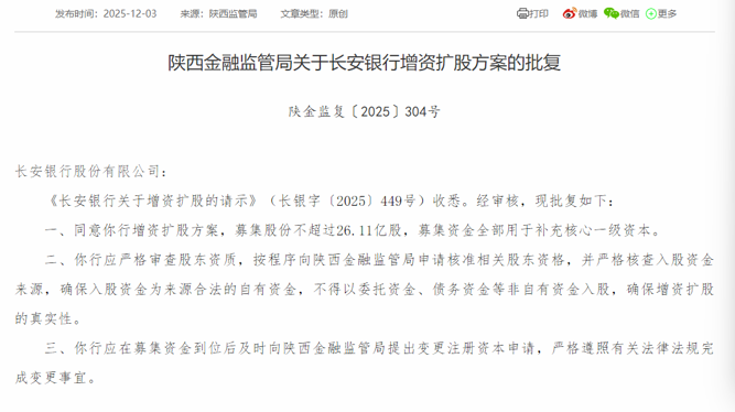 12月3日,国家金融监督管理总局陕西监管局发布行政批复公告,同意长安银行增资扩股方案,募集股份不超过26.11亿股,募集资金全部用于补充核心一级资本。