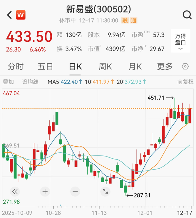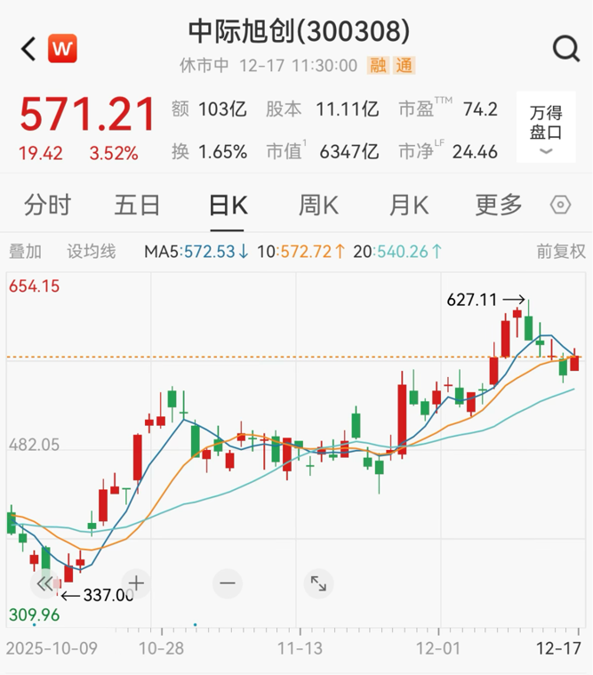截至午盘,中际旭创涨3.52%,报571.21元/股,最新市值为6347亿元。