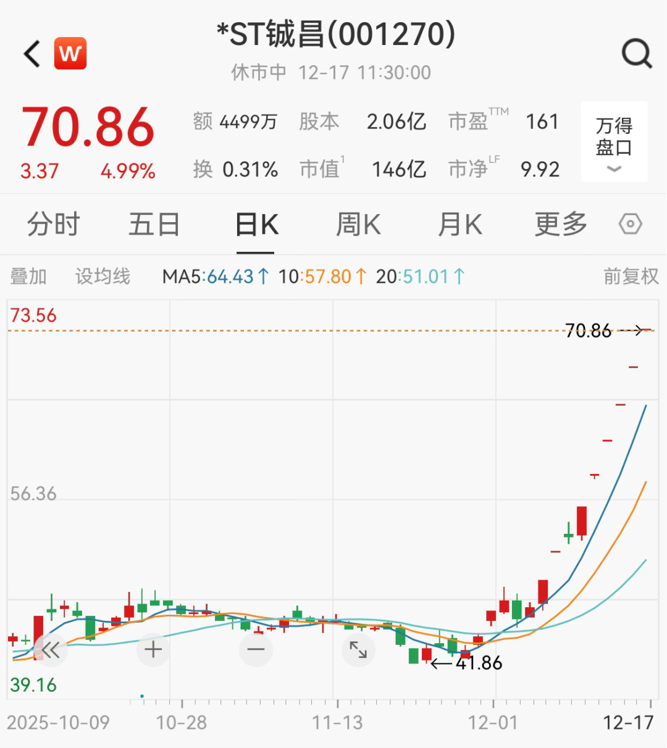 12月17日上午,*ST铖昌再次涨停,现报70.86元/股,走出9天8板。