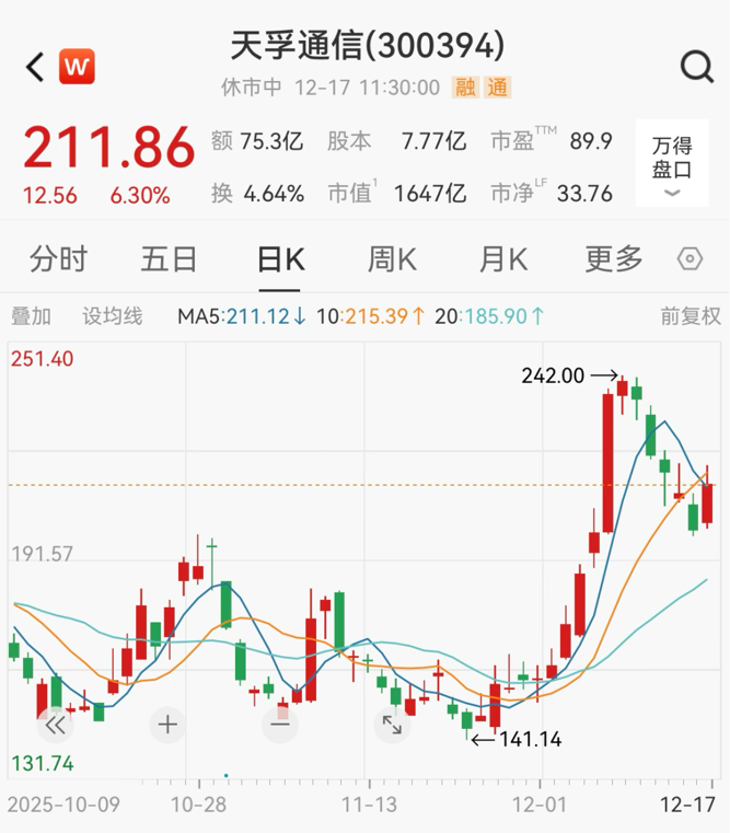 天孚通信涨6.3%,报211.86元/股,最新市值为1647亿元。