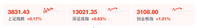 12月17日上午,A股三大股指集体大涨,创业板指涨超1%。截至午间收盘,沪指涨0.17%,深证成指涨0.83%,创业板指涨1.21%。