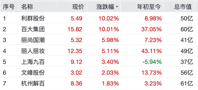 个股方面,利群股份、百大集团录得10cm涨停,丽尚国潮、丽人丽妆、上海九百、文峰股份等均跟涨。