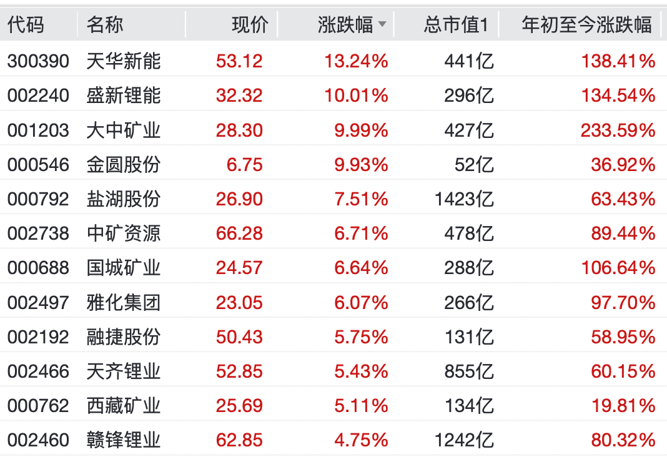 个股方面,盛新锂能、大中矿业、金圆股份录得10cm涨停,盐湖股份涨超7%,赣锋锂业涨超4%,天齐锂业涨超5%,天华新能涨超13%。国城矿业、中矿资源、雅化集团、融捷股份、西藏矿业等均涨超5%。