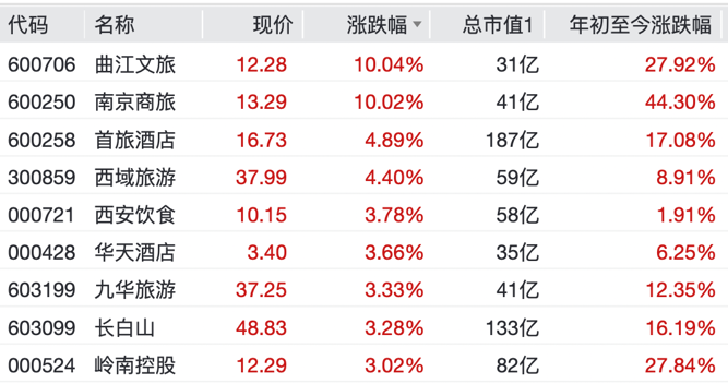 个股方面,曲江文旅、南京商旅录得10cm涨停,首旅酒店、西域旅游、西安饮食、华天酒店、九华旅游等纷纷上涨。