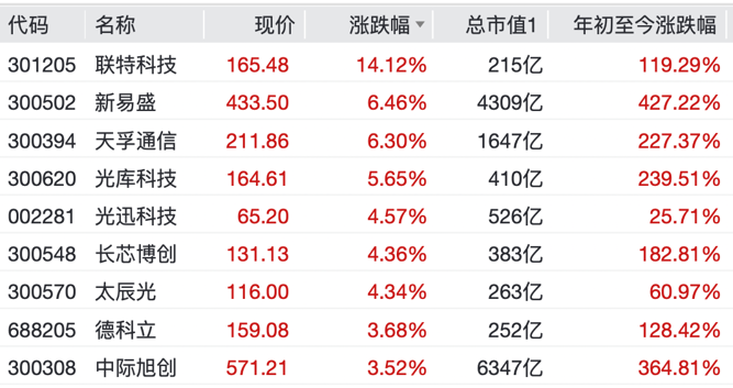 另外,联特科技大涨14.12%,光库科技、长芯博创、光迅科技等跟涨。