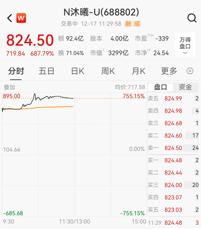 沐曦股份中午824.5元的收盘价,超过摩尔线程,成为A股新的第三高价股;总市值为3298.8亿元,也超越摩尔线程,居A股热股第一名。
