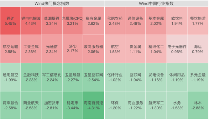 从板块看,大科技集体反弹,锂矿、CPO概念股走高,通信设备、化肥农药、旅游酒店板块涨幅居前;而此前上涨幅度较大的海南自贸区、商业航天等概念板块下挫。
