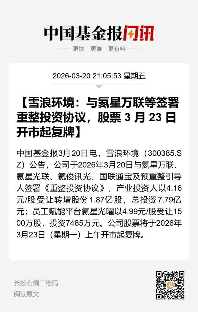 停牌4天后,筹划重整的雪浪环境将自3月23日(星期一)上午开市起复牌。