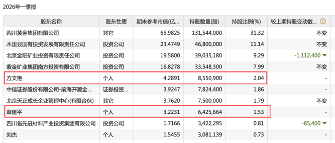 四川黄金一季度的十大股东名单中也出现了章建平的名字,其持股642.57万股,占总股本的1.53%,是该股第八大股东。值得一提的是,在四川黄金的股东名单中,章建平的妻子方文艳亦以855.09万股的持仓位列第五大股东,两人合计持股近1500万股。
