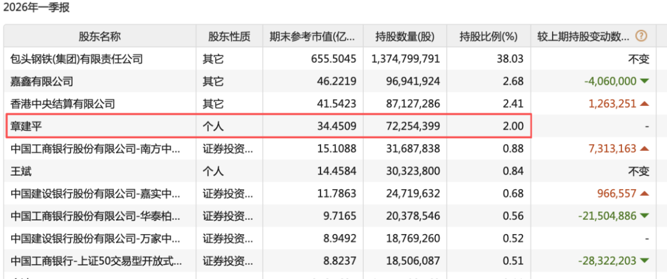 4月28日晚间,北方稀土发布2026年一季报。公司前十大股东名单中出现了章建平的名字:章建平持股7225.44万股,占总股本的2%,新进成为第四大股东。按一季度末股价计算,其持股市值高达34.45亿元。