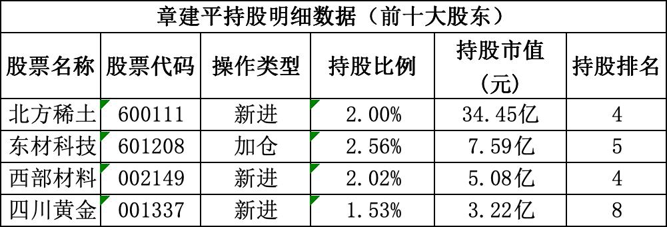 数据显示,截至一季度末,章建平共出现在四只个股的前十大股东名单中,除北方稀土外,还包括东材科技、西部材料和四川黄金。其中,除东材科技为加仓外,其余三只均为一季度新进。