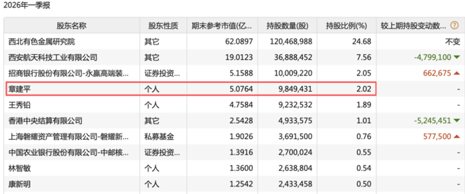 章建平新进成为西部材料的第四大股东,持有984.94万股,持股比例为2.02%。