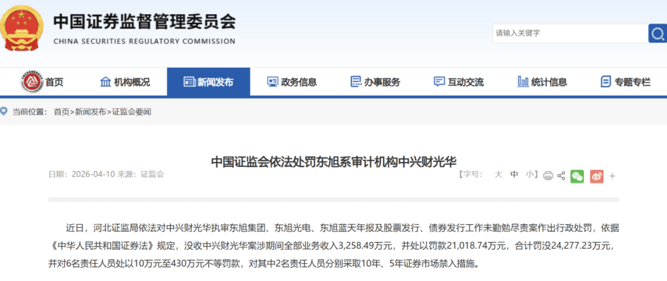 4月10日,证监会官网消息显示,证监会依法处罚东旭系审计机构中兴财光华,合计罚没金额达2.4亿元。