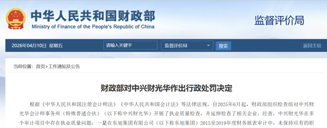 4月10日,财政部亦公布对中兴财光华作出行政处罚决定的消息。