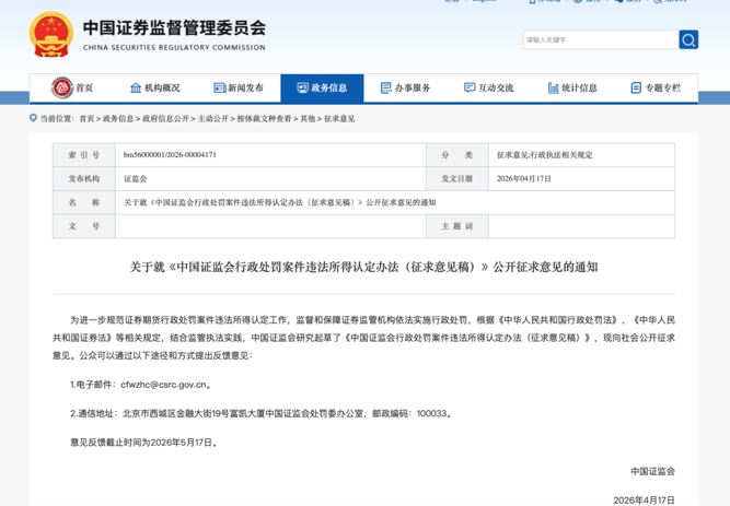 4月17日,证监会发布消息称,为进一步规范证券期货行政处罚案件违法所得认定工作,监督和保障证券监管机构依法实施行政处罚,中国证监会研究起草了《中国证监会行政处罚案件违法所得认定办法(征求意见稿)》(以下简称《办法》征求意见稿),意见反馈截止时间为2026年5月17日。