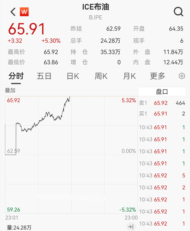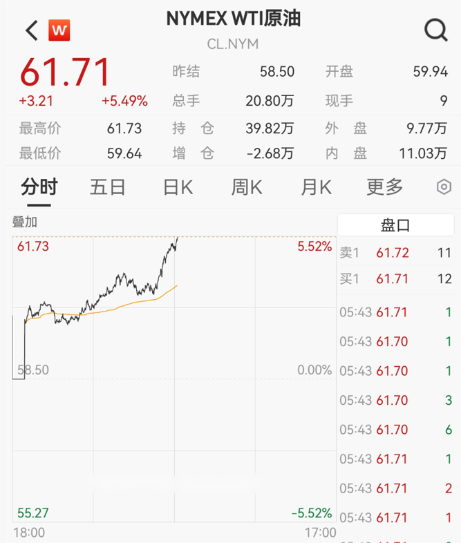 布伦特原油期货逼近66美元/桶,WTI原油期货涨超61.7美元/桶。