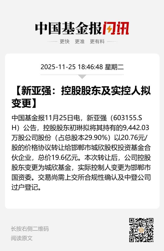 根据公告,11月24日,初琳与城欣基金签署《股份转让协议》,约定初琳以20.76元/股的价格向城欣基金协议转让新亚强9442.03万股股份,占公司总股本的29.90%,交易总金额为19.60亿元。