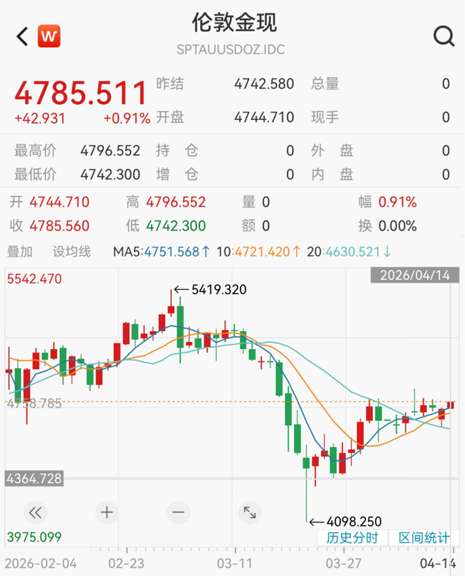 4月14日,现货黄金直逼4800美元关口,最高报4796.552美元/盎司,一度涨超1%,最新约4785美元/盎司。