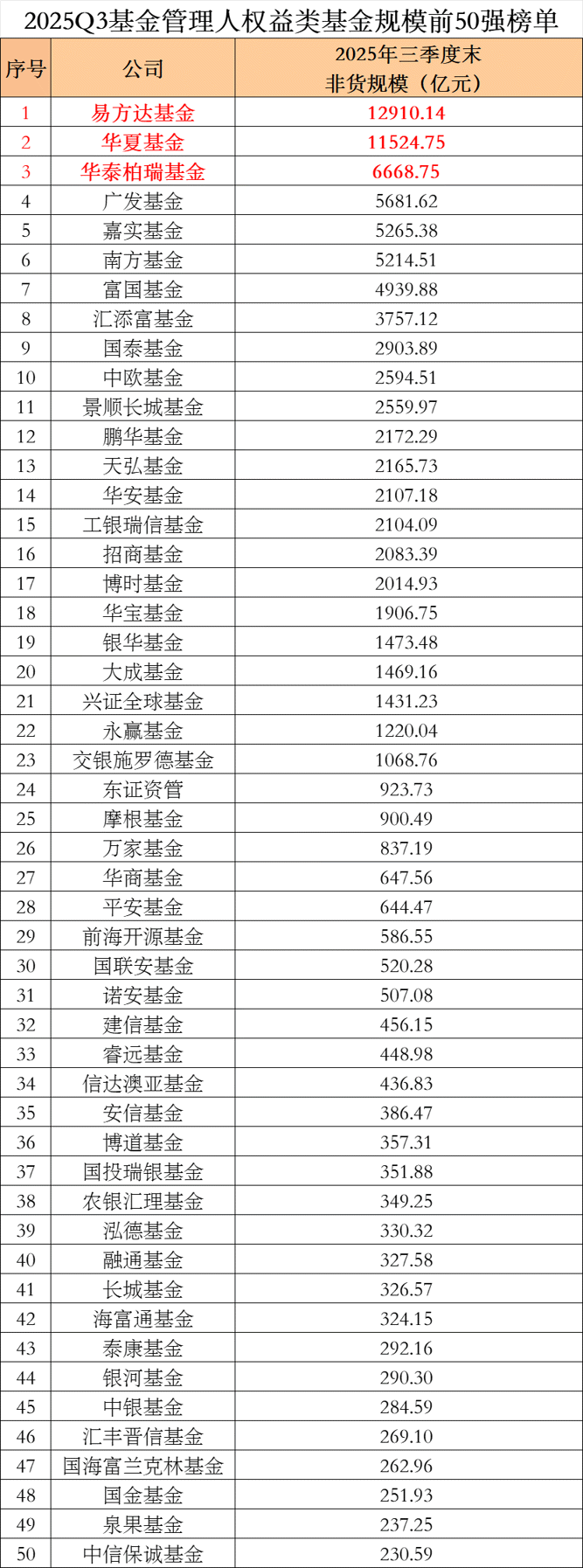 权益资产再度成为市场的焦点,这既为擅长主动权益投资的机构,也为股票ETF领域占据头部地位的公募基金提供了规模增长的重要机遇,同时基金公司管理规模也出现相应调整。其中,权益投资规模占比高、核心竞争力突出的基金公司,在三季度实现了更为显著的规模增长。