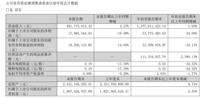 前三季度累计归母净利润为5377.55万元,同比大幅下滑34.06%;扣非后归母净利润为5359.9万元,同比下降34.15%。