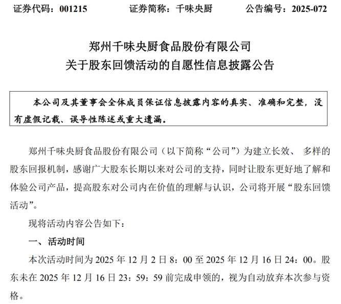 与峨眉山A不同,千味央厨的回馈股东活动,仅限于12月1日收盘前的持股股东,而峨眉山是2025年12月1日至2026年1月31日,持500股以上股东可免景区、索道门票。
