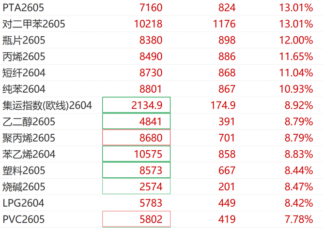此外,对二甲苯、PTA、瓶片等品种纷纷涨停,乙二醇、苯乙烯、纯苯等盘中触及涨停。
