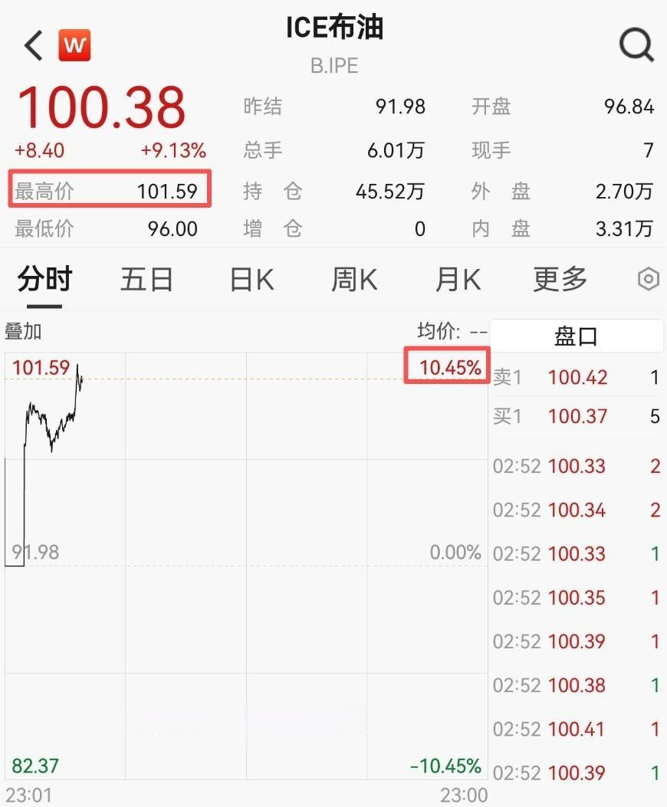 随着中东局势持续紧张,国际油价再度攀升。3月12日上午,布伦特原油直线走高,盘中最高达101.59美元/桶,涨幅超10%。