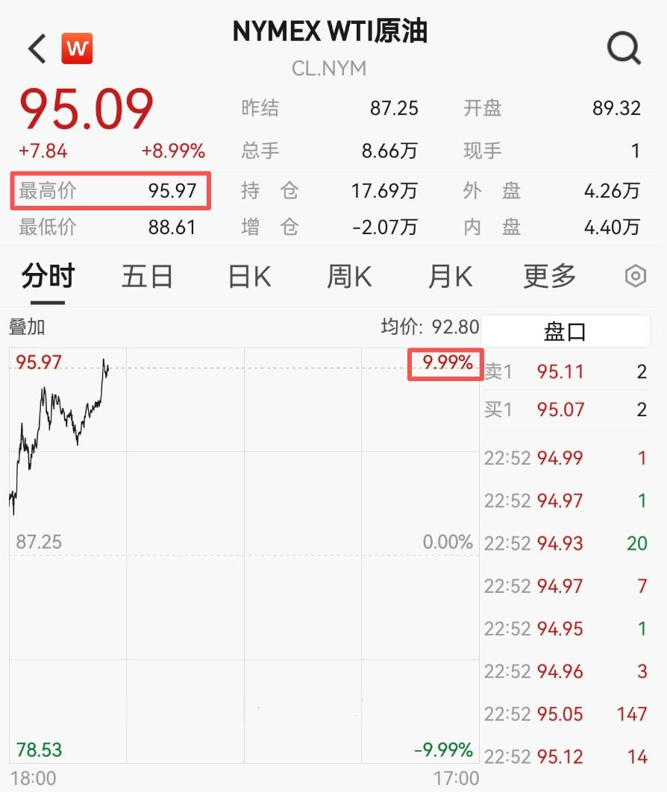 WTI原油一度逼近96美元/桶,涨幅近10%。