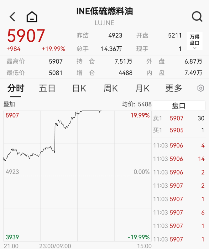 国内市场上,低硫燃料油主力合约强势触及涨停板,报5907元/吨,涨幅达19.99%。