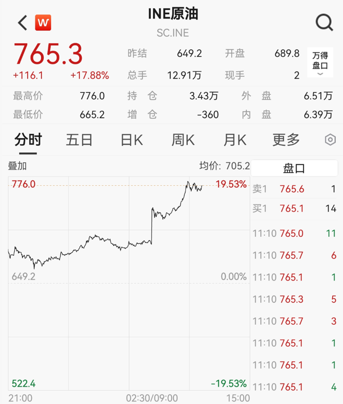 原油主力合约一度涨超19%,截至发稿,涨超17%。