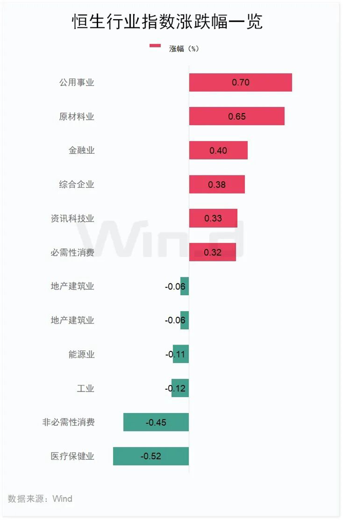 从行业表现看,恒生行业指数日内涨跌不一,公用事业指数涨0.7%,原材料业指数涨0.65%,金融业指数涨0.4%。跌幅方面,医疗保健业指数跌0.52%,非必需性消费行业指数跌0.45%,工业指数跌0.12%。